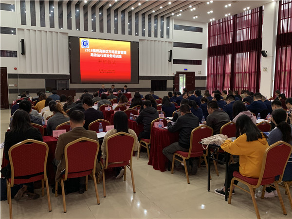 12月6日-7日,由福州高新区市场监督管理局主办,我院承办的“2018年福州高新区市场监督管理局依法行政业务培训班”在福建中医药大学国际中医药培训中心开班。福州高新区市场监督管理局副局长李迎春,福州高新区党工委委员、管委会副调研员熊国华,副院长方方以及来自福州高新区市场监督管理局的干部职工、各企业人员共107名学员参加培训,开班仪式由李迎春主持。